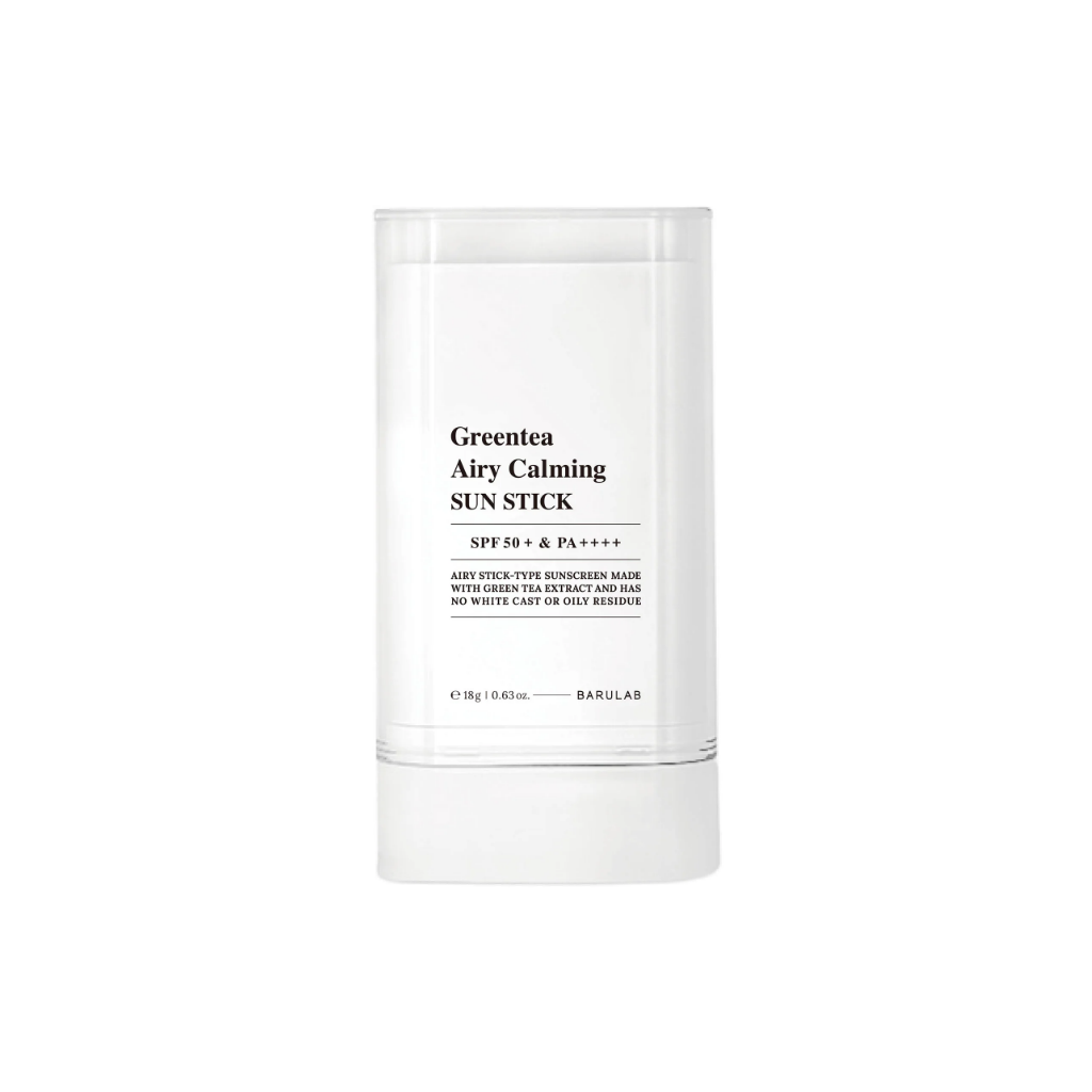 Opalovací tyčinka BARULAB Greentea Airy Calming Sun Stick poskytuje vysokou ochranu proti UVA i UVB záření díky SPF 50+ a PA++++ v praktické formě, ideální pro snadnou aplikaci během dne.
